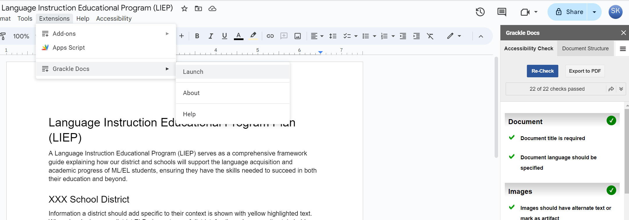 Open a Google Doc. (This will not work with a Word Document - you have to convert a Word Document to a Google Document by going to File/Save As Google Doc). Once you have opened the Google Doc, from the top menu, go to extensions, hover over grackle docs and select launch from the side menu pop up. The application will launch in the pane on the right side. It will begin checking your document automatically.