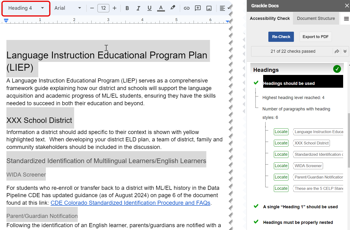 In the same way that you typically format different sections in your document for visual readers, headings are used for screen readers to provide the same experience for those who use them. Headings are set at the top menu bar in the drop down for styles. A single Heading 1 (H1) should be used for the title. Headings must be nested. For example, you are not allowed to have a Heading 1 (H1), Heading 2 (H2), Heading 4 (H4). You must have a Heading 3 (H3) to have a Heading 4 (H4).