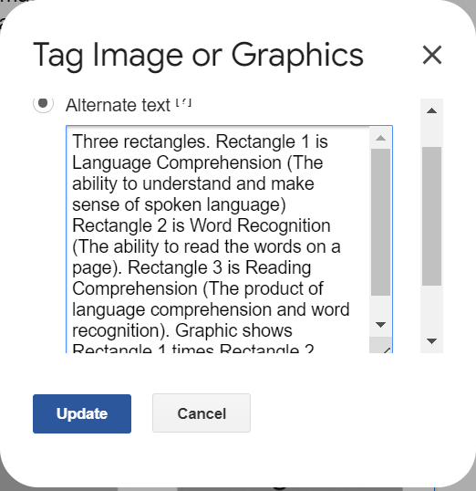 Click on Locate in the Grackle menu to be taken to the section in your document where the instance is within the document. Click on TAG to open the dialog which displays the current Alt text. Validate Alt text is accurate for the image. If changes are needed, you can make the changes in this dialog box and click update.